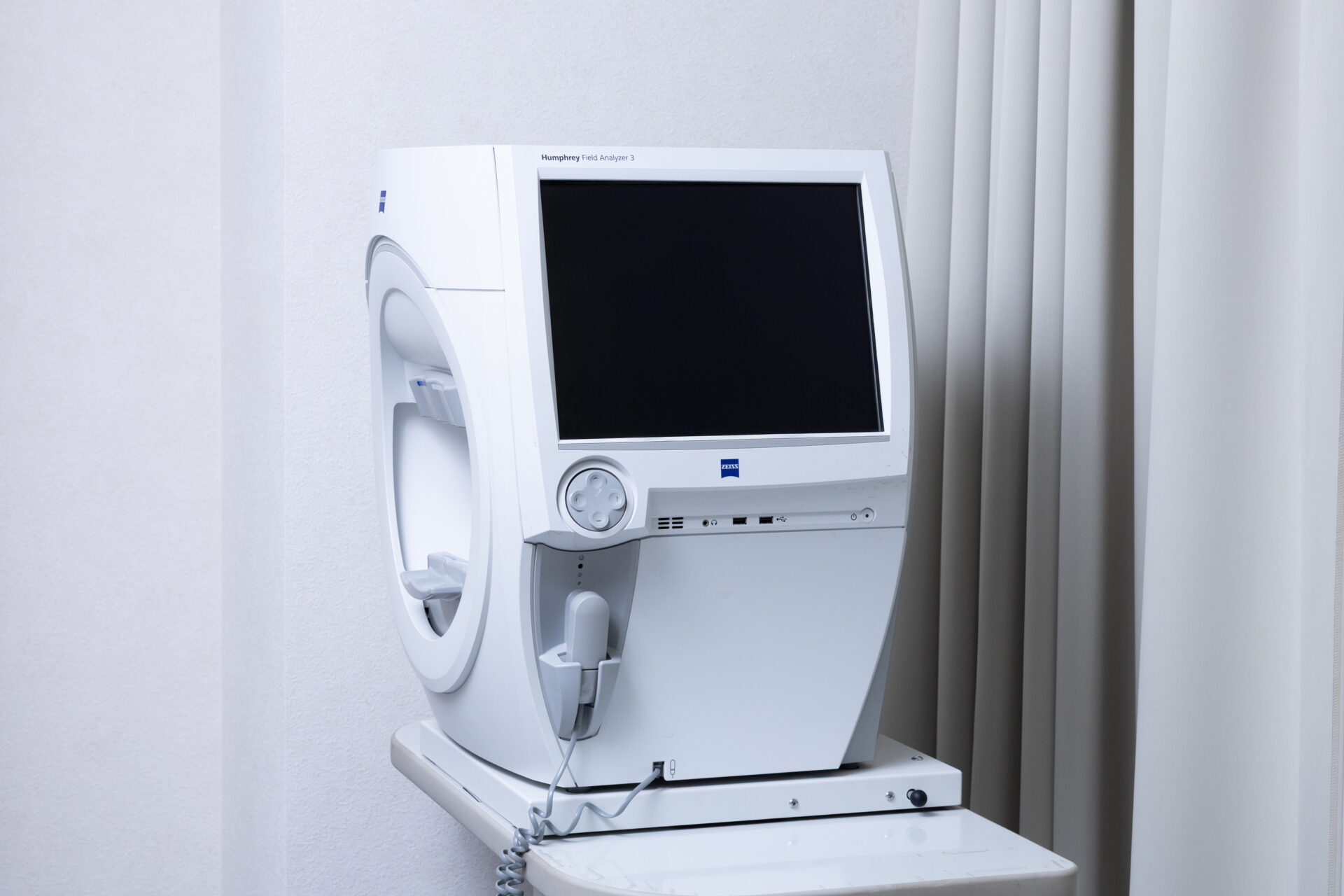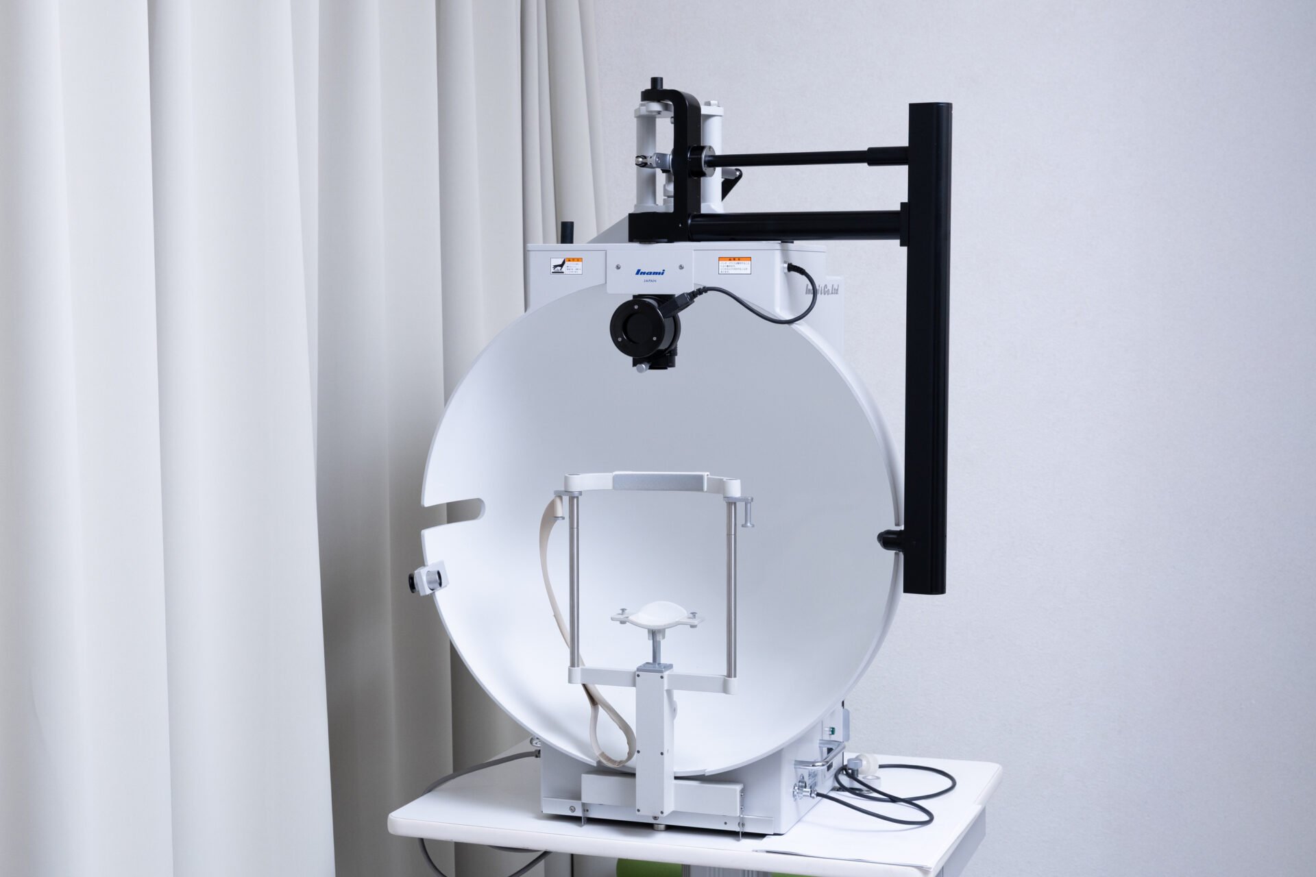 中心を見つめた状態で、視野および光に対する感度を測定する検査機器です。